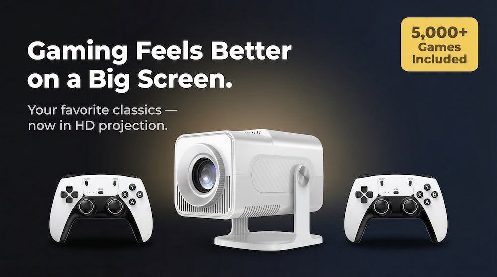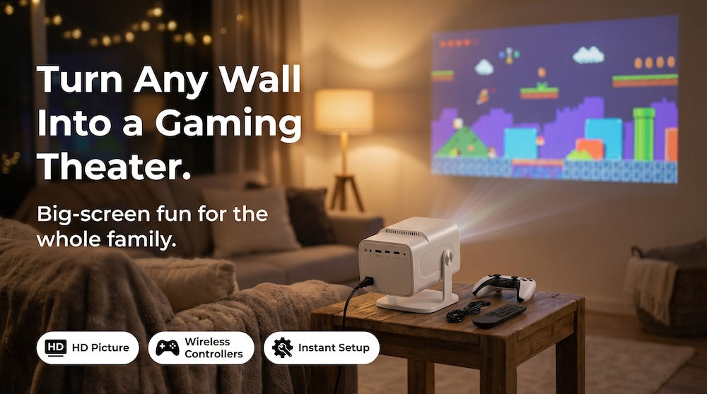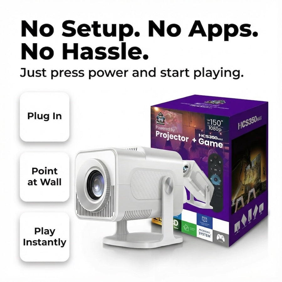 A portable projector and retro gaming console combined — no setup, no extra hardware, instant fun.